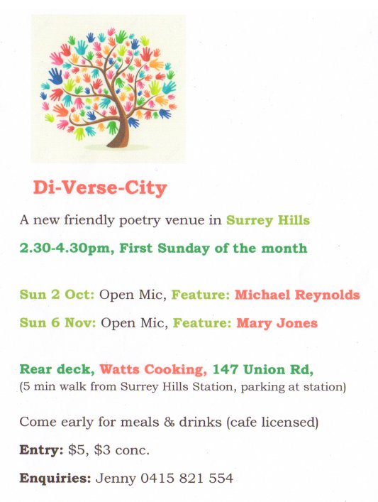 I am to be the feature poet at the November Di-Verse-City poetry event, on Sunday November 6th in Surrey Hills, Melbourne.